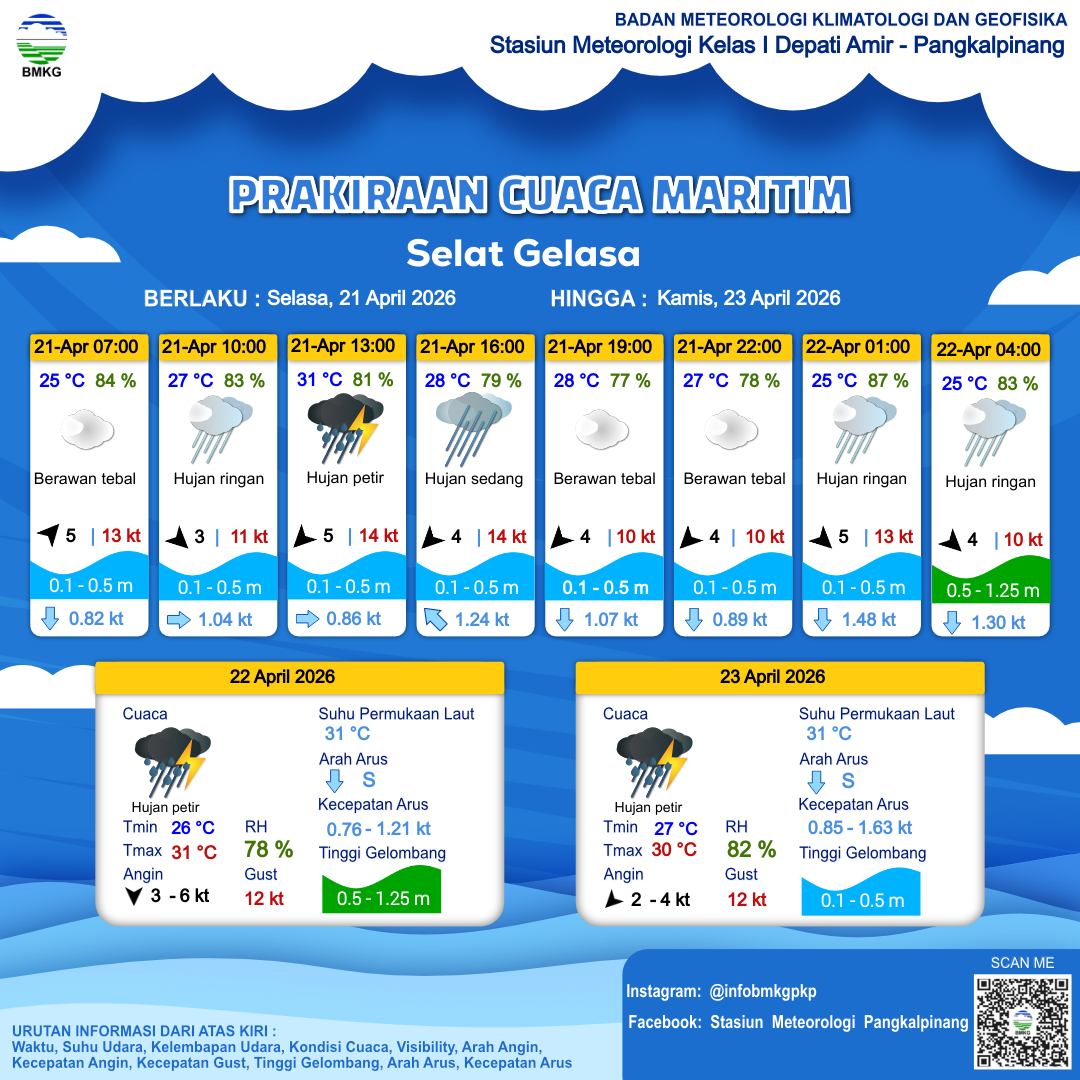 21 Apr 26, 03.00 11 jam kedepan | Barat 5 kt Gust Peningkatan kecepatan angin yang singkat dan tiba-tiba : 10 kt | 0.4 m Tenang | Timur 0.9 Knots | 27 °C | 80 % | |
