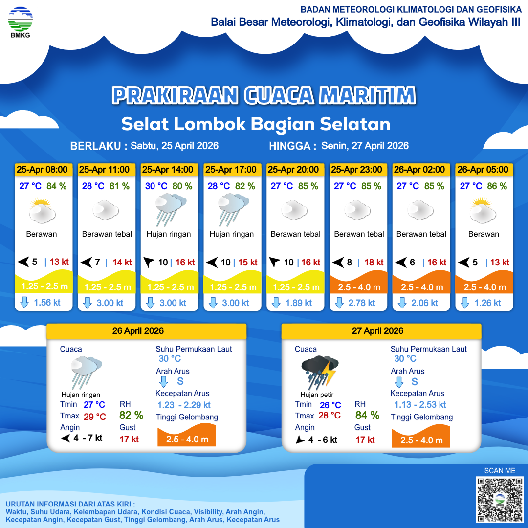 23 Apr 26, 22.00 3 jam kedepan | Cerah Berawan | Timur 6 kt Gust Peningkatan kecepatan angin yang singkat dan tiba-tiba : 14 kt | | | 28 °C | 84 % |