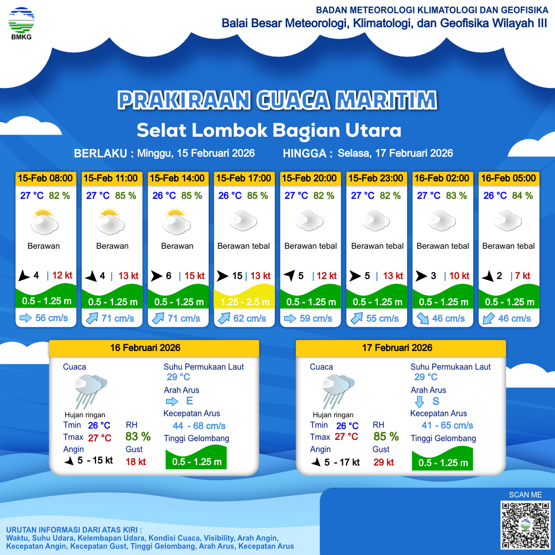 15 Feb 26, 14.00 5 jam kedepan | Barat 5 kt Gust Peningkatan kecepatan angin yang singkat dan tiba-tiba : 12 kt | 1 m Rendah | Timur Laut 58.0 cm/s | 27 °C | 82 % | |