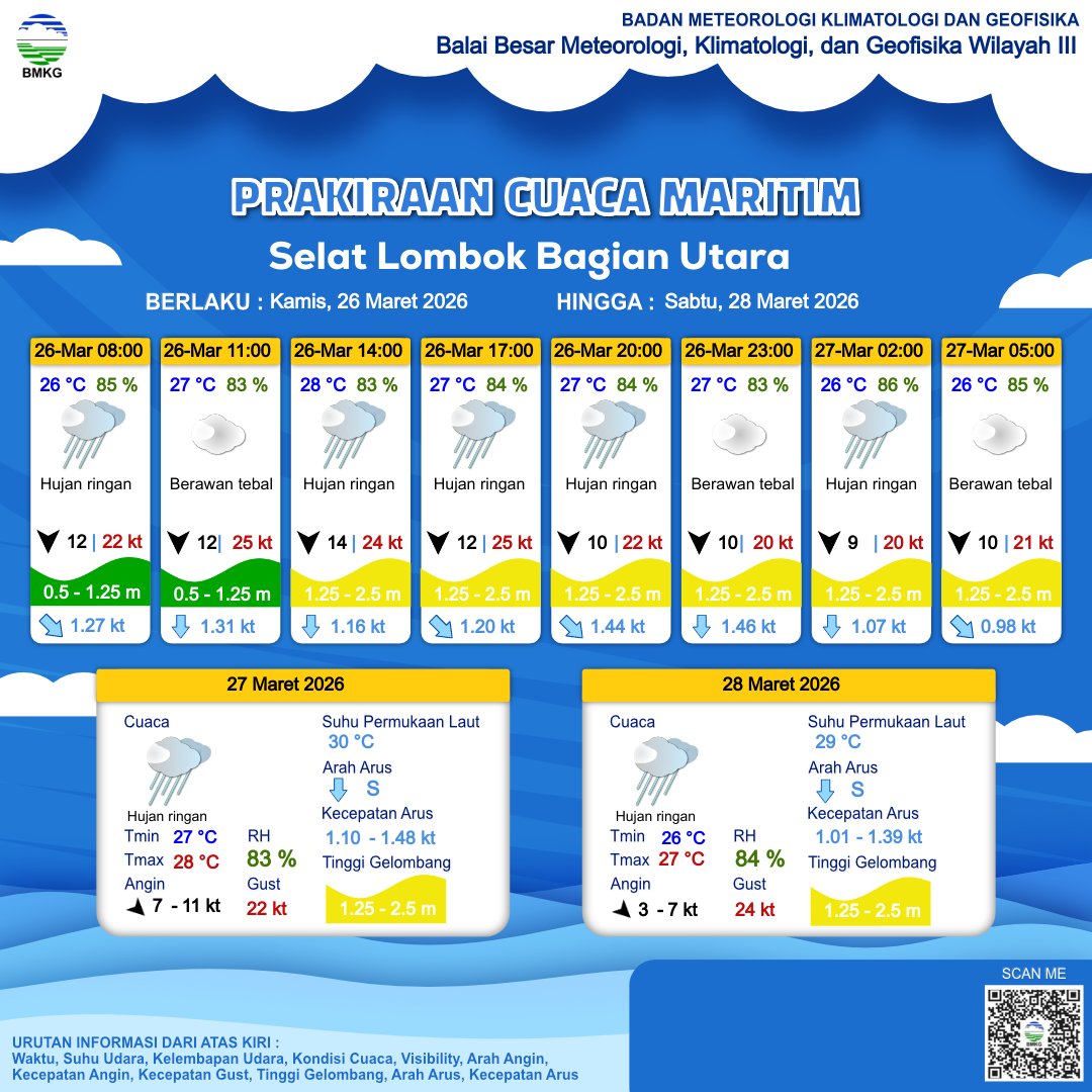 27 Mar 26, 09.00 10 jam kedepan | Utara 6 kt Gust Peningkatan kecepatan angin yang singkat dan tiba-tiba : 15 kt | 1.7 m Sedang | Selatan 1.1 Knots | 28 °C | 80 % | |