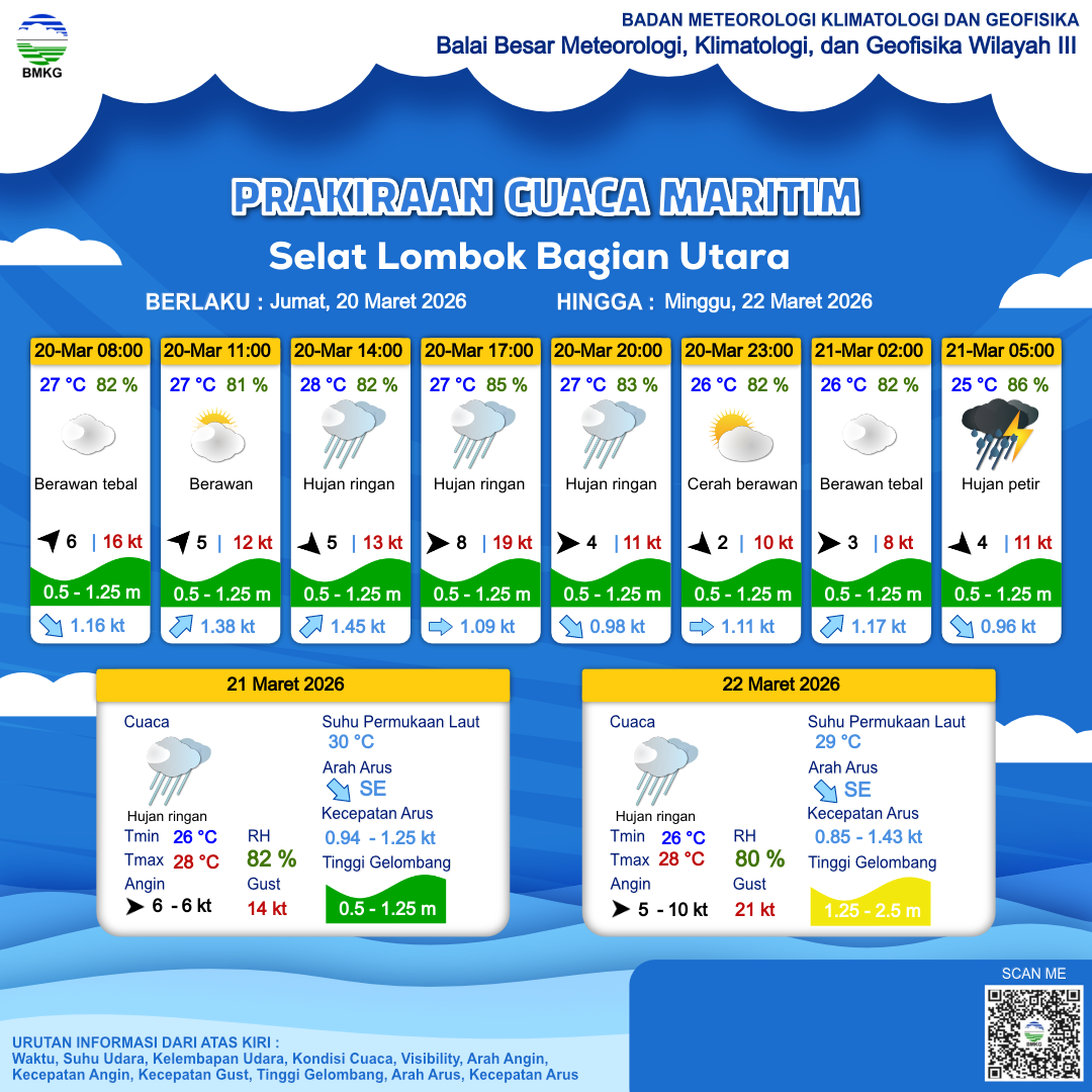 20 Mar 26, 19.00 2 jam kedepan | Barat 3 kt Gust Peningkatan kecepatan angin yang singkat dan tiba-tiba : 9 kt | 0.8 m Rendah | Timur 1.2 Knots | 26 °C | 83 % | |