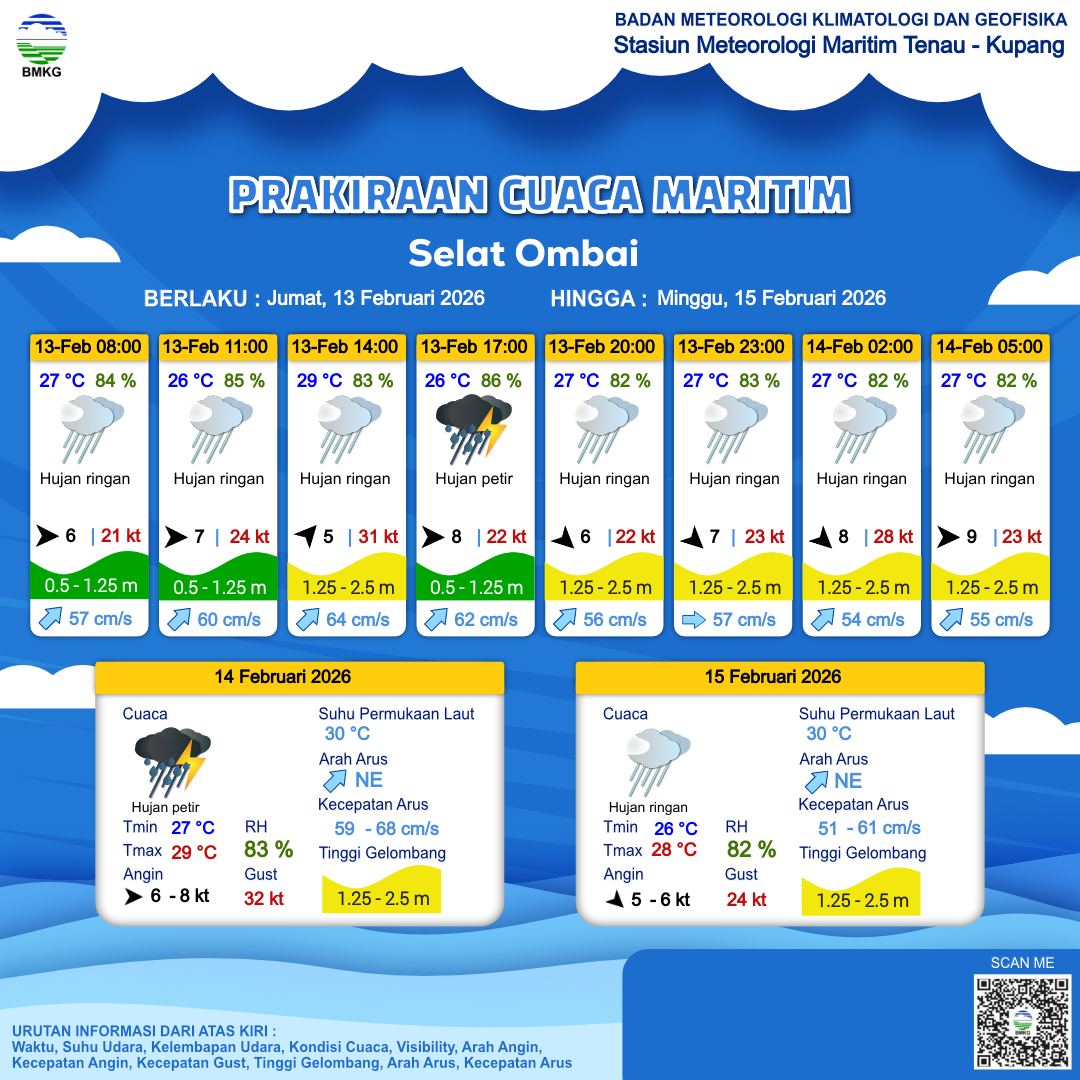 13 Feb 26, 22.00 18 jam kedepan | Barat 9 kt Gust Peningkatan kecepatan angin yang singkat dan tiba-tiba : 23 kt | 1.5 m Sedang | Timur Laut 56.0 cm/s | 27 °C | 83 % | |