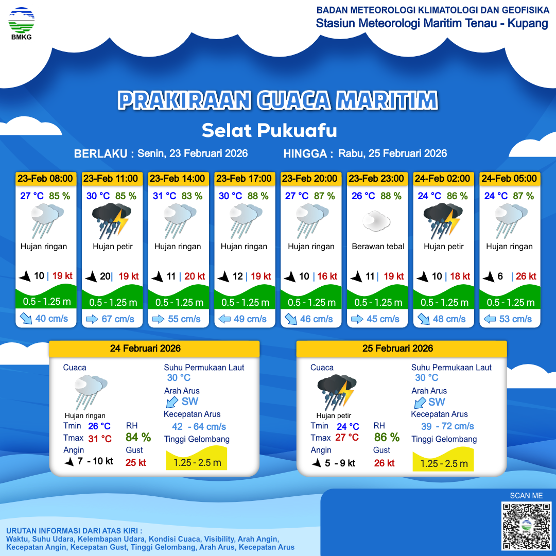 22 Feb 26, 23.00 2 jam kedepan | Berawan Tebal | Barat Laut 15 kt Gust Peningkatan kecepatan angin yang singkat dan tiba-tiba : 19 kt | | | 27 °C | 87 % |