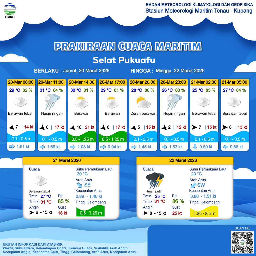 20 Mar 26, 20.00 20 jam kedepan | Barat 8 kt Gust Peningkatan kecepatan angin yang singkat dan tiba-tiba : 15 kt | 0.5 m Rendah | Barat 0.9 Knots | 26 °C | 85 % | |