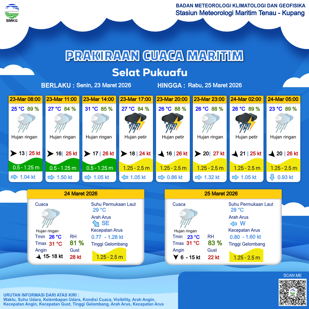 23 Mar 26, 22.00 11 jam kedepan | Barat Laut 20 kt Gust Peningkatan kecepatan angin yang singkat dan tiba-tiba : 27 kt | 1.7 m Sedang | Barat 0.9 Knots | 24 °C | 87 % | |