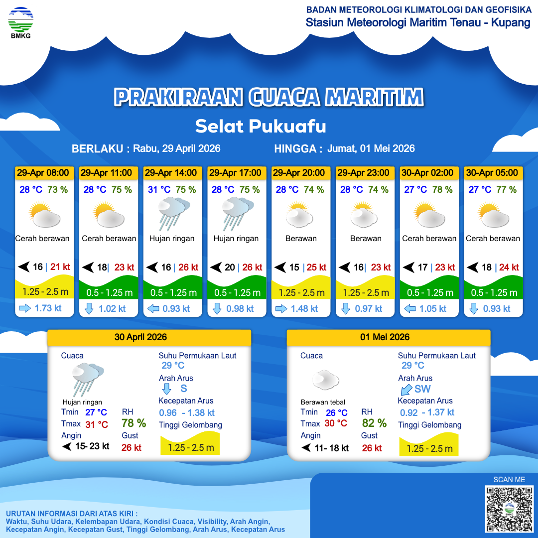 28 Apr 26, 08.00 8 jam kedepan | Timur 16 kt Gust Peningkatan kecepatan angin yang singkat dan tiba-tiba : 22 kt | 1.5 m Sedang | Selatan 1.0 Knots | 29 °C | 78 % | |