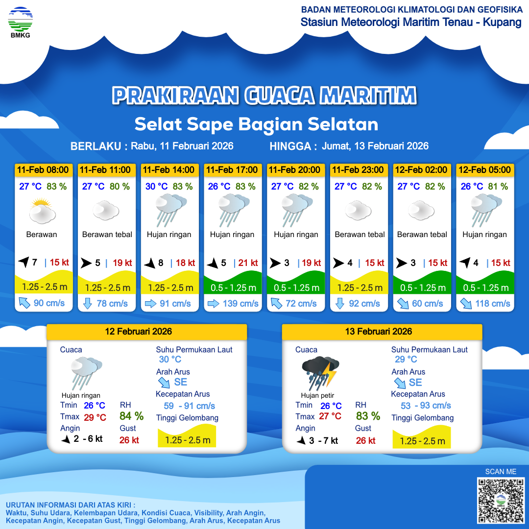 12 Feb 26, 20.00 4 jam kedepan | Barat Laut 3 kt Gust Peningkatan kecepatan angin yang singkat dan tiba-tiba : 20 kt | 1 m Rendah | Timur 56.0 cm/s | 26 °C | 84 % | |