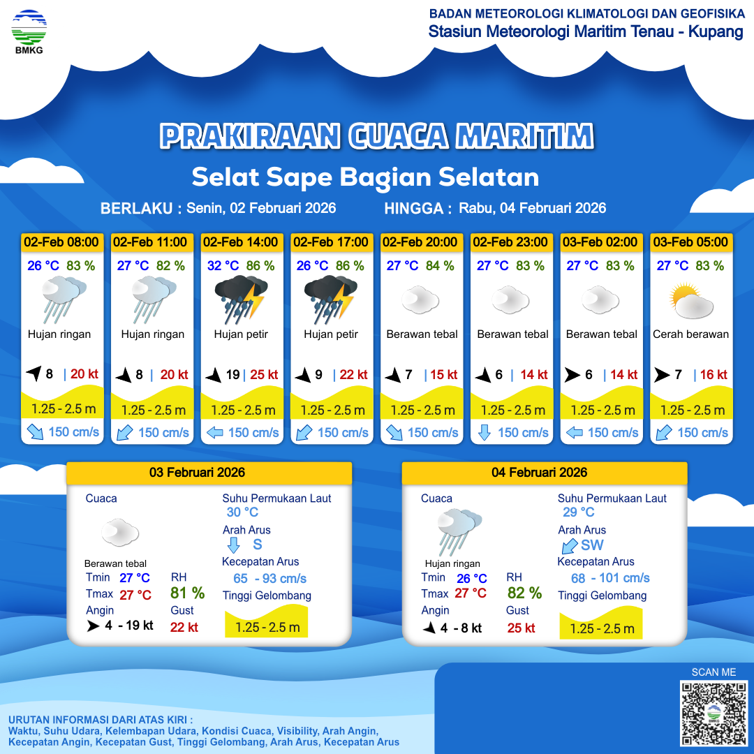 2 Feb 26, 23.00 4 jam kedepan | Cerah Berawan | Barat 8 kt Gust Peningkatan kecepatan angin yang singkat dan tiba-tiba : 18 kt | | | 27 °C | 82 % |