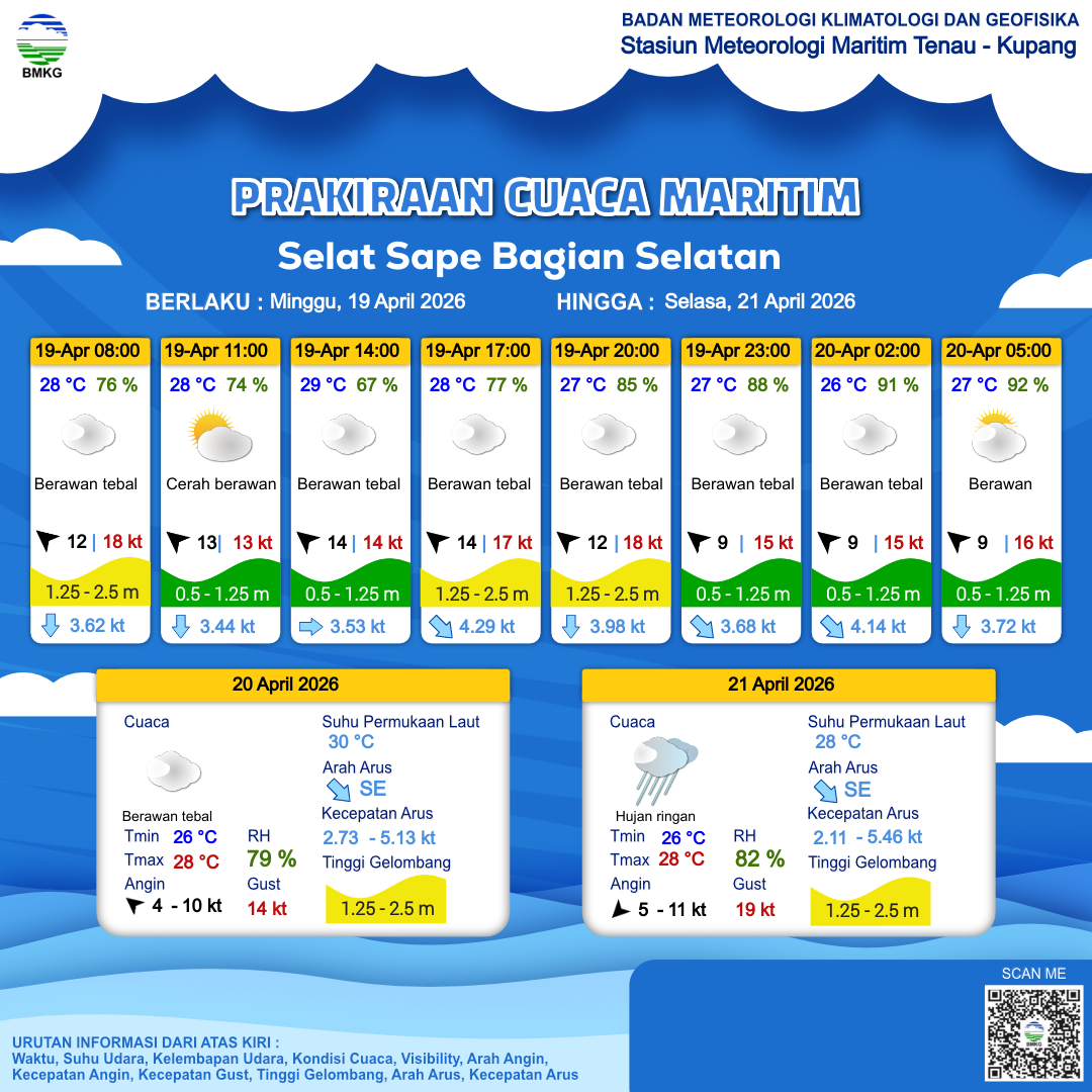 19 Apr 26, 23.00 4 jam kedepan | Berawan Tebal | Tenggara 10 kt Gust Peningkatan kecepatan angin yang singkat dan tiba-tiba : 14 kt | | | 27 °C | 85 % |