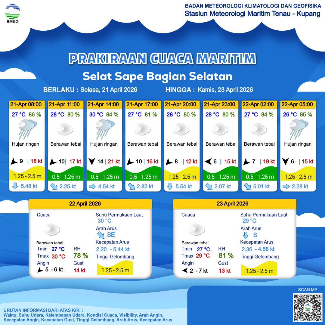 22 Apr 26, 06.00 6 jam kedepan | Timur 5 kt Gust Peningkatan kecepatan angin yang singkat dan tiba-tiba : 14 kt | 1.1 m Rendah | Tenggara 4.0 Knots | 30 °C | 76 % | |