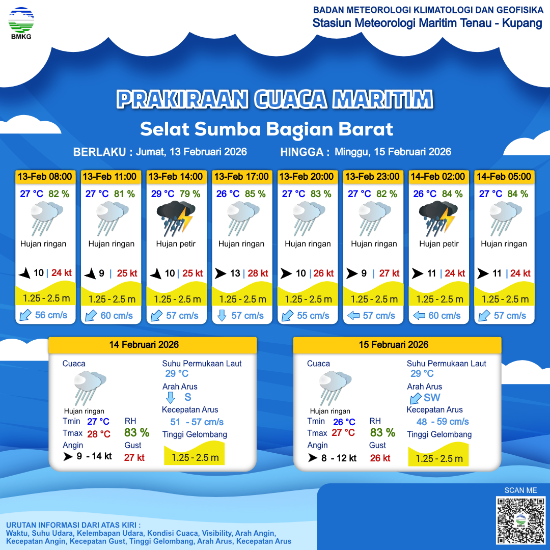 13 Feb 26, 10.00 12 jam kedepan | Barat 13 kt Gust Peningkatan kecepatan angin yang singkat dan tiba-tiba : 32 kt | 2 m Sedang | Selatan 57.0 cm/s | 26 °C | 84 % | |
