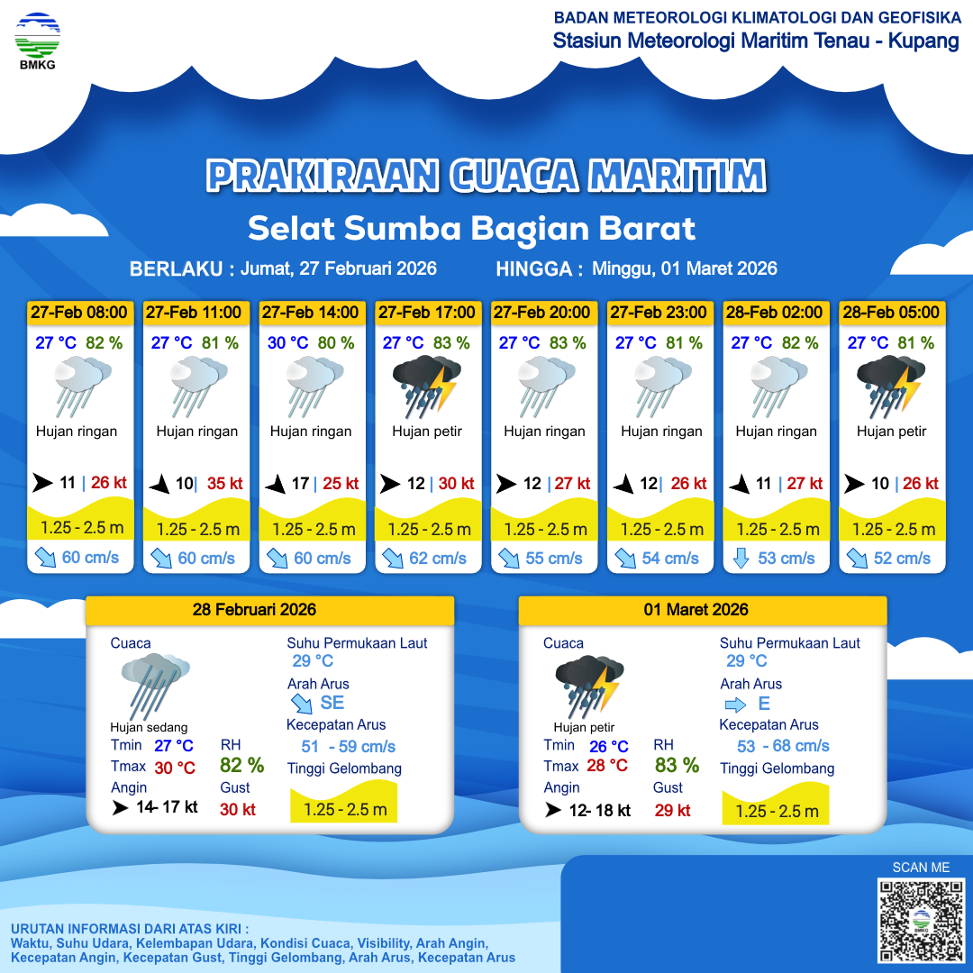 27 Feb 26, 06.00 4 jam kedepan | Barat Laut 17 kt Gust Peningkatan kecepatan angin yang singkat dan tiba-tiba : 25 kt | 2.5 m Tinggi | Tenggara 60.0 cm/s | 30 °C | 80 % | |