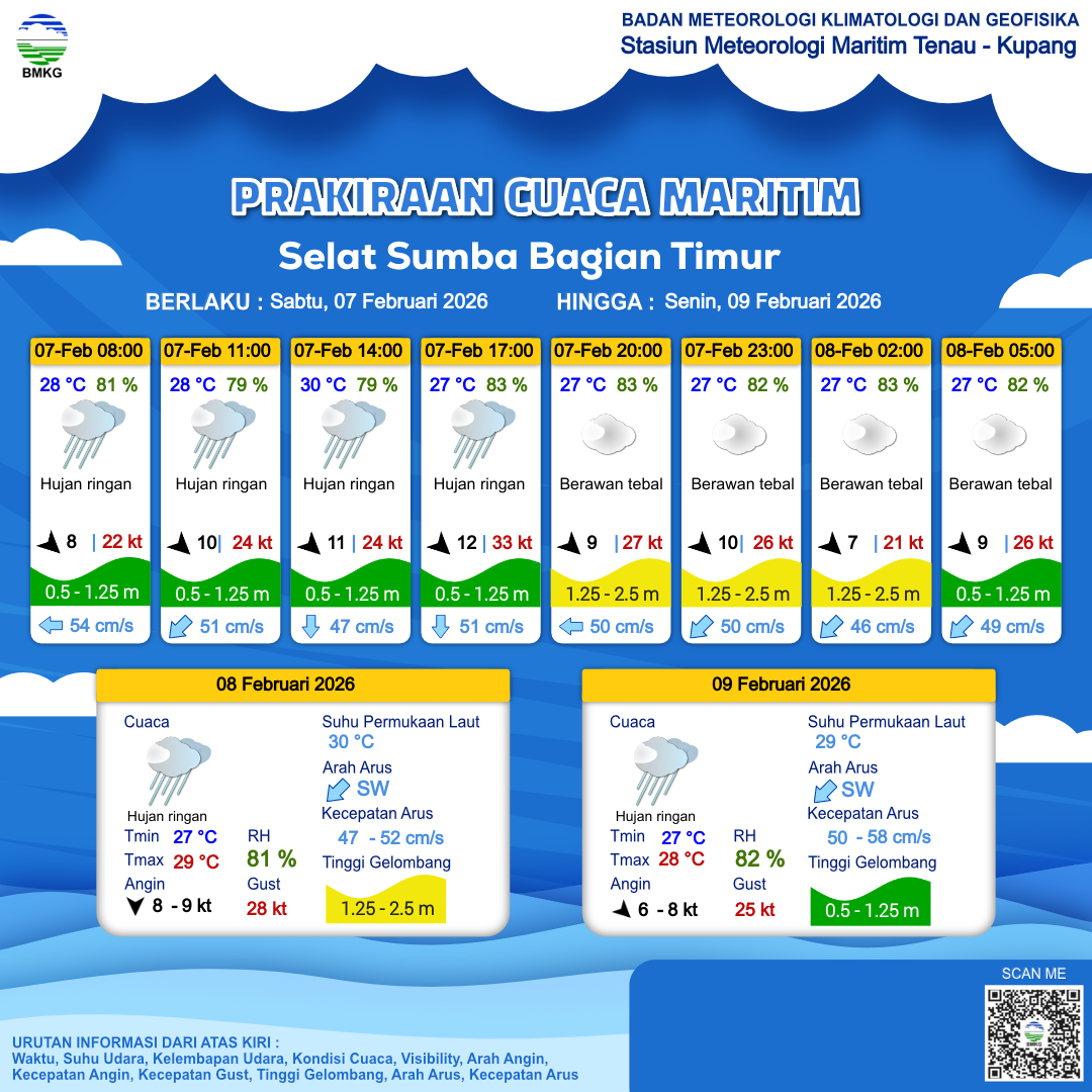 7 Feb 26, 23.00 9 jam kedepan | Utara 8 kt Gust Peningkatan kecepatan angin yang singkat dan tiba-tiba : 24 kt | 1.1 m Rendah | Barat Daya 52.0 cm/s | 27 °C | 83 % |