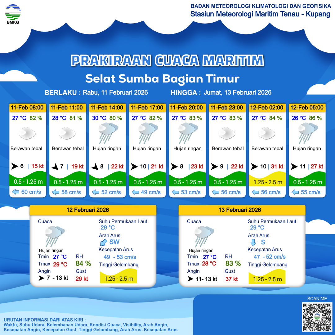 11 Feb 26, 23.00 6 jam kedepan | Barat 7 kt Gust Peningkatan kecepatan angin yang singkat dan tiba-tiba : 28 kt | 1 m Rendah | Barat 54.0 cm/s | 27 °C | 84 % |
