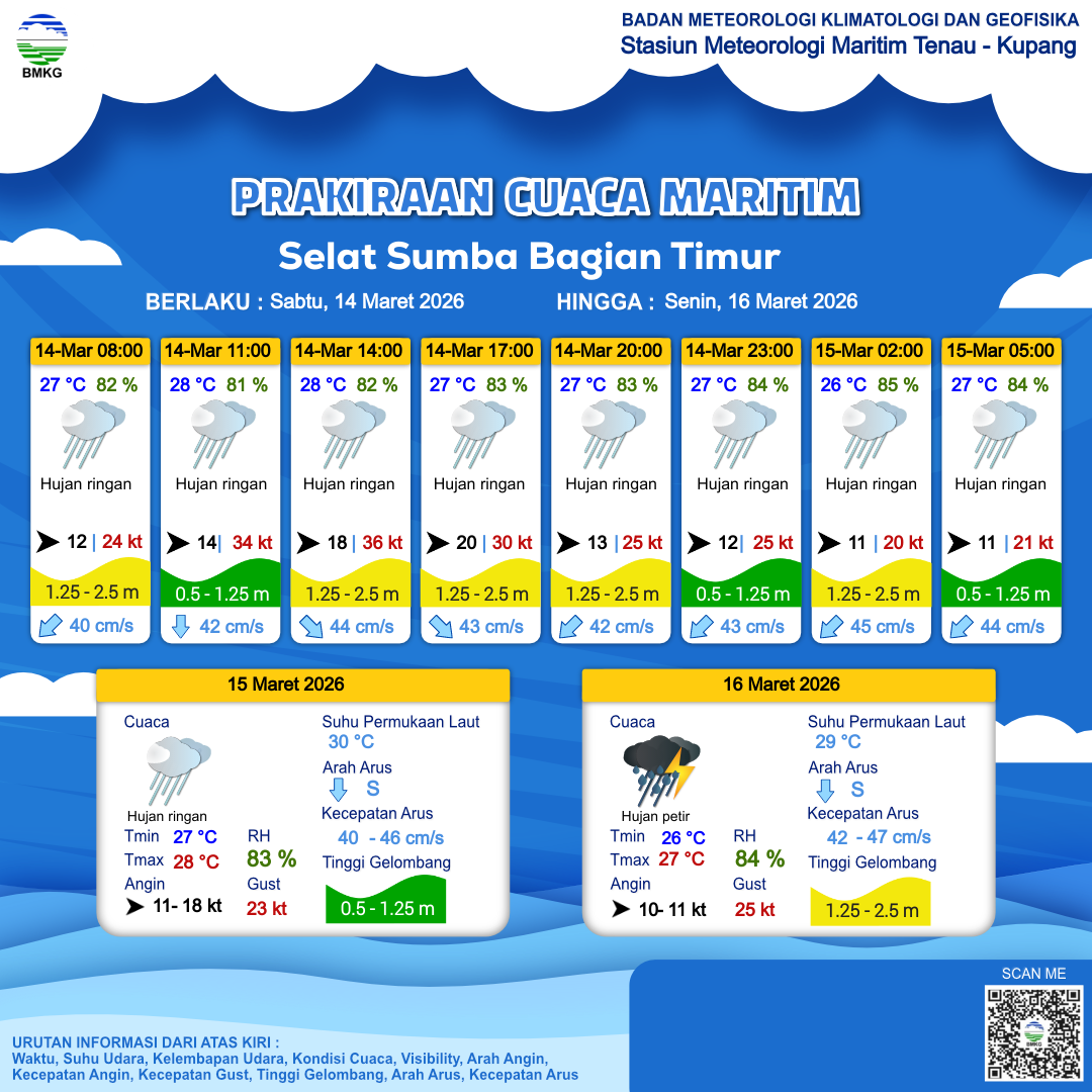 14 Mar 26, 14.00 4 jam kedepan | Barat 12 kt Gust Peningkatan kecepatan angin yang singkat dan tiba-tiba : 30 kt | 1.2 m Rendah | Selatan 42.0 cm/s | 27 °C | 83 % | |