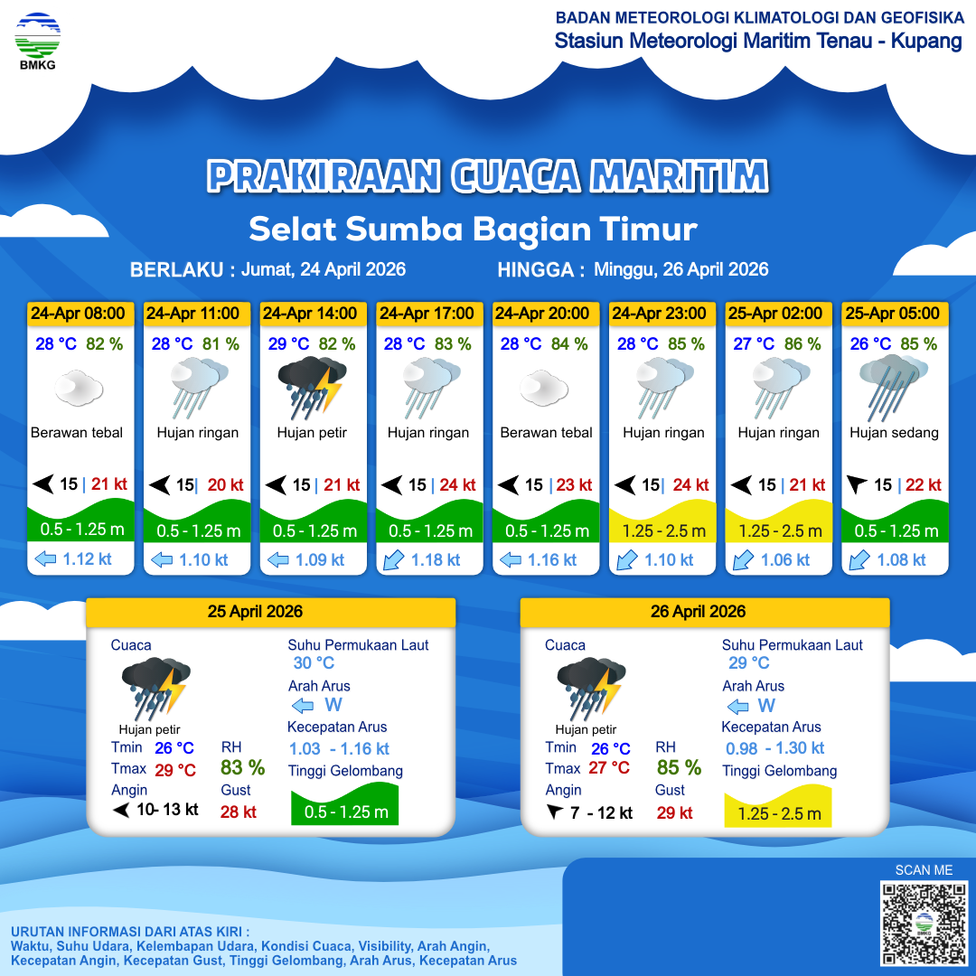23 Apr 26, 16.00 3 jam kedepan | Tenggara 8 kt Gust Peningkatan kecepatan angin yang singkat dan tiba-tiba : kt | 1 m Rendah | Barat 1.2 Knots | 25 °C | 83 % | |
