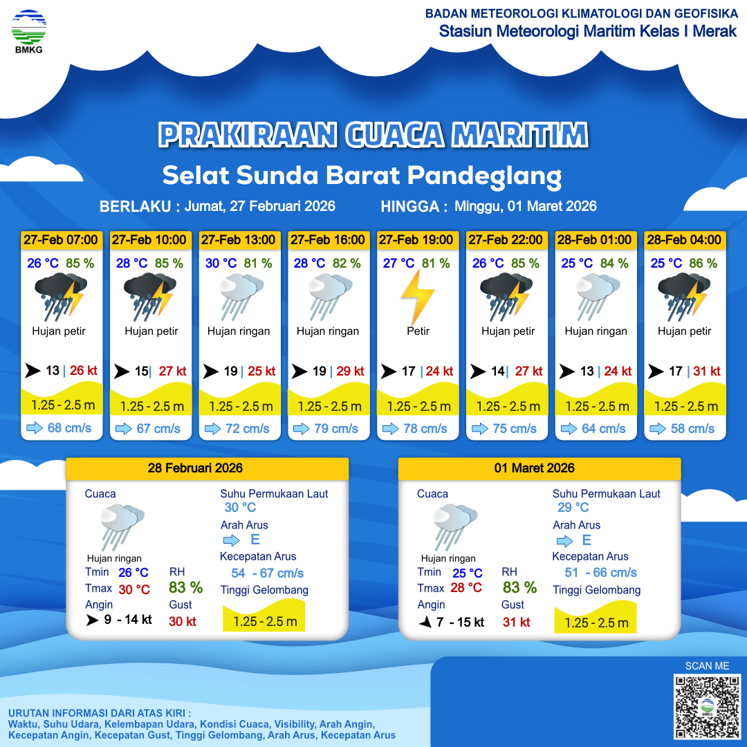 27 Feb 26, 22.00 2 jam kedepan | Hujan Ringan | Barat 17 kt Gust Peningkatan kecepatan angin yang singkat dan tiba-tiba : 29 kt | | | 25 °C | 85 % |