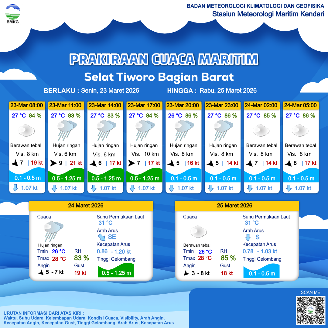 23 Mar 26, 21.00 3 jam kedepan | Berawan Tebal | Barat Laut 8 kt Gust Peningkatan kecepatan angin yang singkat dan tiba-tiba : 17 kt | | | 27 °C | 86 % |