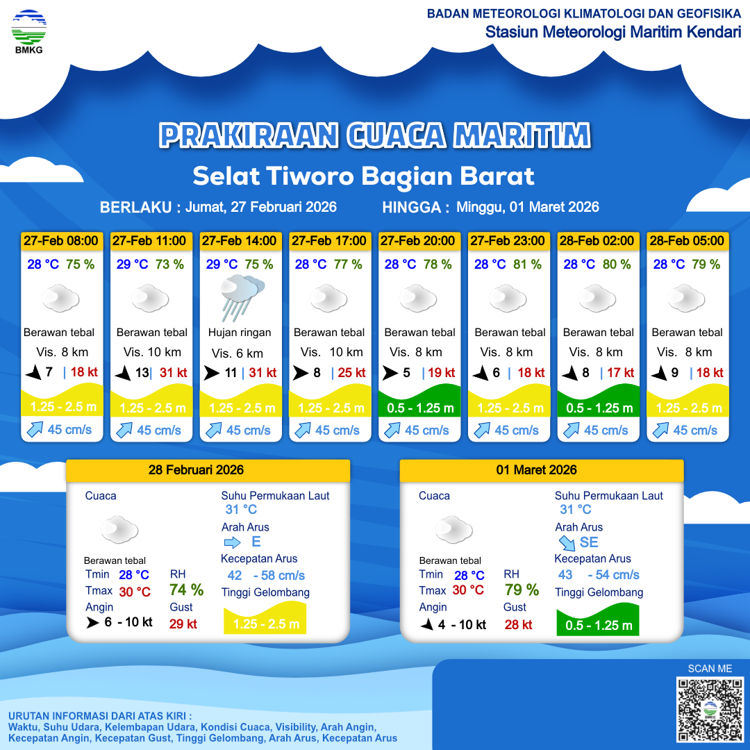 27 Feb 26, 22.00 2 jam kedepan | Berawan Tebal | Barat Laut 9 kt Gust Peningkatan kecepatan angin yang singkat dan tiba-tiba : 19 kt | | | 28 °C | 78 % |