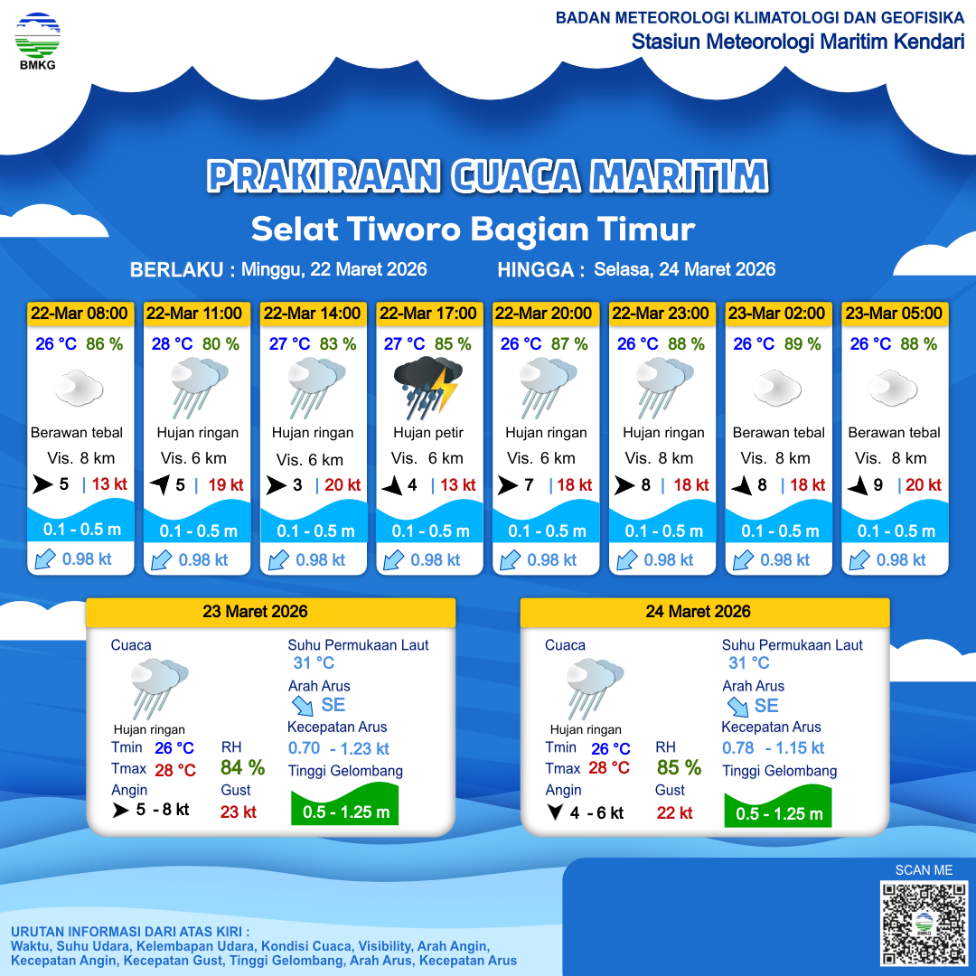 22 Mar 26, 15.00 3 jam kedepan | Barat 8 kt Gust Peningkatan kecepatan angin yang singkat dan tiba-tiba : 18 kt | 0.5 m Rendah | Selatan 0.8 Knots | 26 °C | 88 % | |