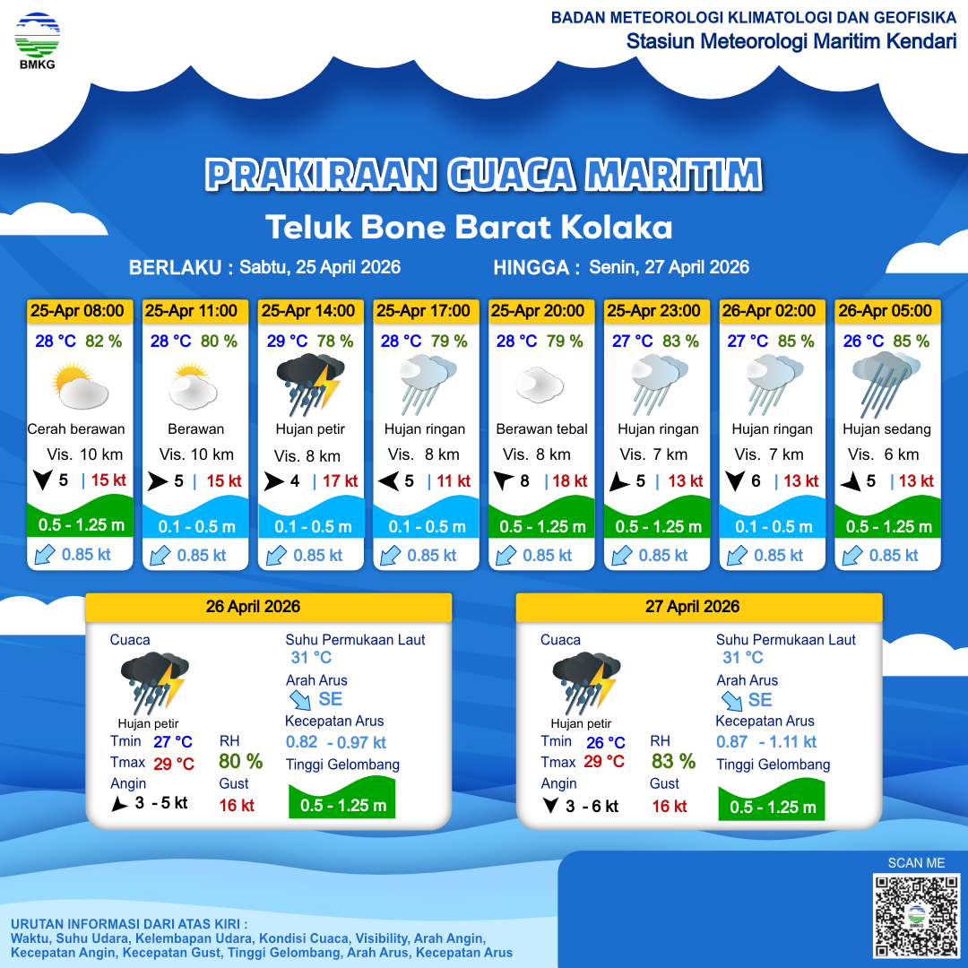 25 Apr 26, 18.00 3 jam kedepan | Utara 6 kt Gust Peningkatan kecepatan angin yang singkat dan tiba-tiba : 13 kt | 0.5 m Rendah | Selatan 0.8 Knots | 27 °C | 85 % | |