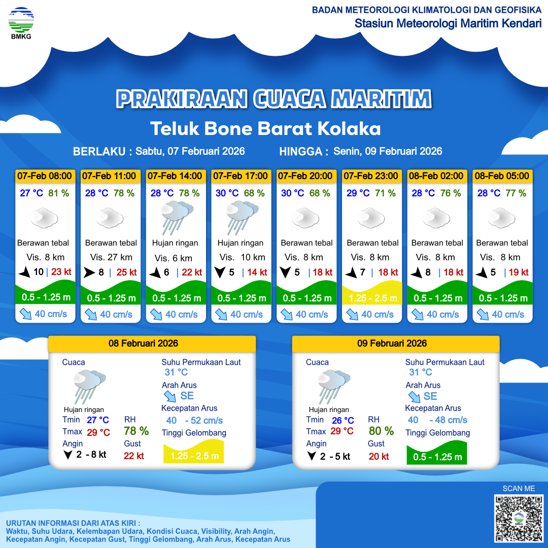 7 Feb 26, 04.00 2 jam kedepan | Barat 8 kt Gust Peningkatan kecepatan angin yang singkat dan tiba-tiba : 23 kt | 1 m Rendah | Timur 45.0 cm/s | 28 °C | 77 % | |