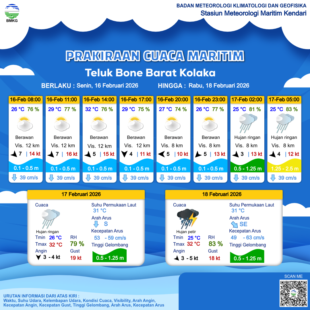 16 Feb 26, 23.00 3 jam kedepan | Berawan Tebal | Utara 3 kt Gust Peningkatan kecepatan angin yang singkat dan tiba-tiba : 11 kt | | | 26 °C | 82 % |