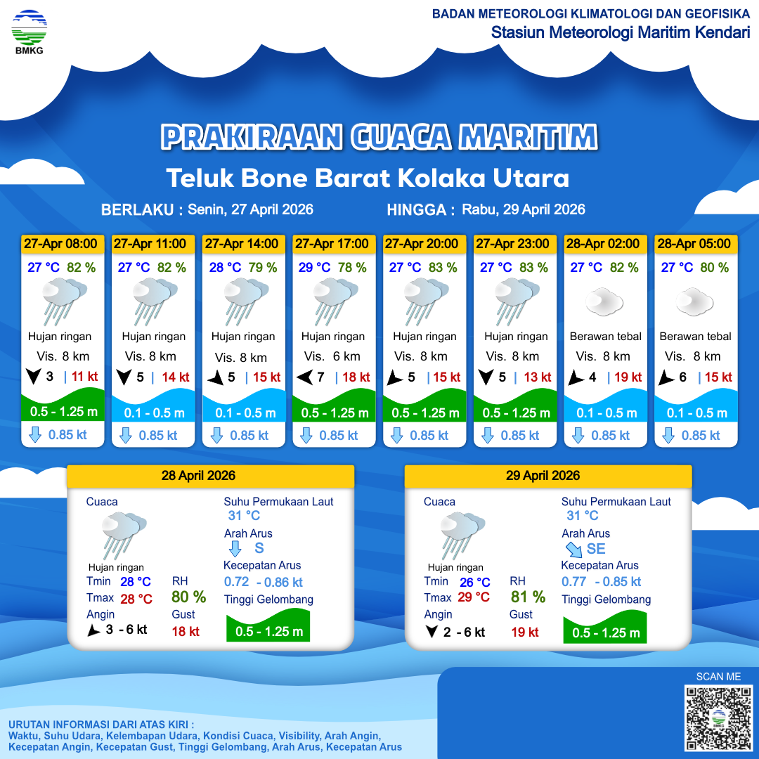27 Apr 26, 03.00 3 jam kedepan | Utara 5 kt Gust Peningkatan kecepatan angin yang singkat dan tiba-tiba : 14 kt | 0.4 m Tenang | Barat Daya 0.9 Knots | 27 °C | 82 % | |