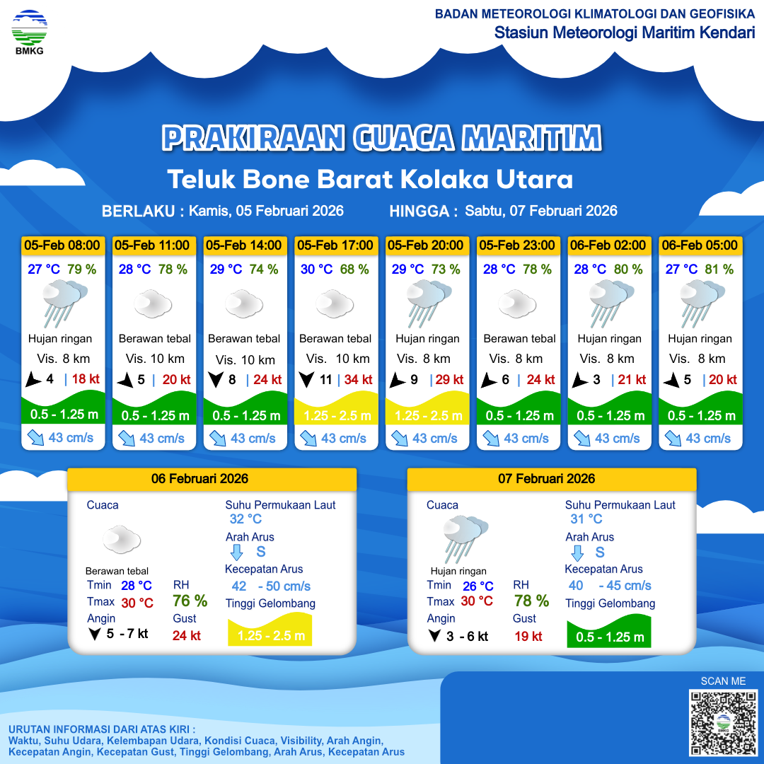 5 Feb 26, 09.00 2 jam kedepan | Utara 11 kt Gust Peningkatan kecepatan angin yang singkat dan tiba-tiba : 34 kt | 1.6 m Sedang | Barat Daya 57.0 cm/s | 30 °C | 68 % | |