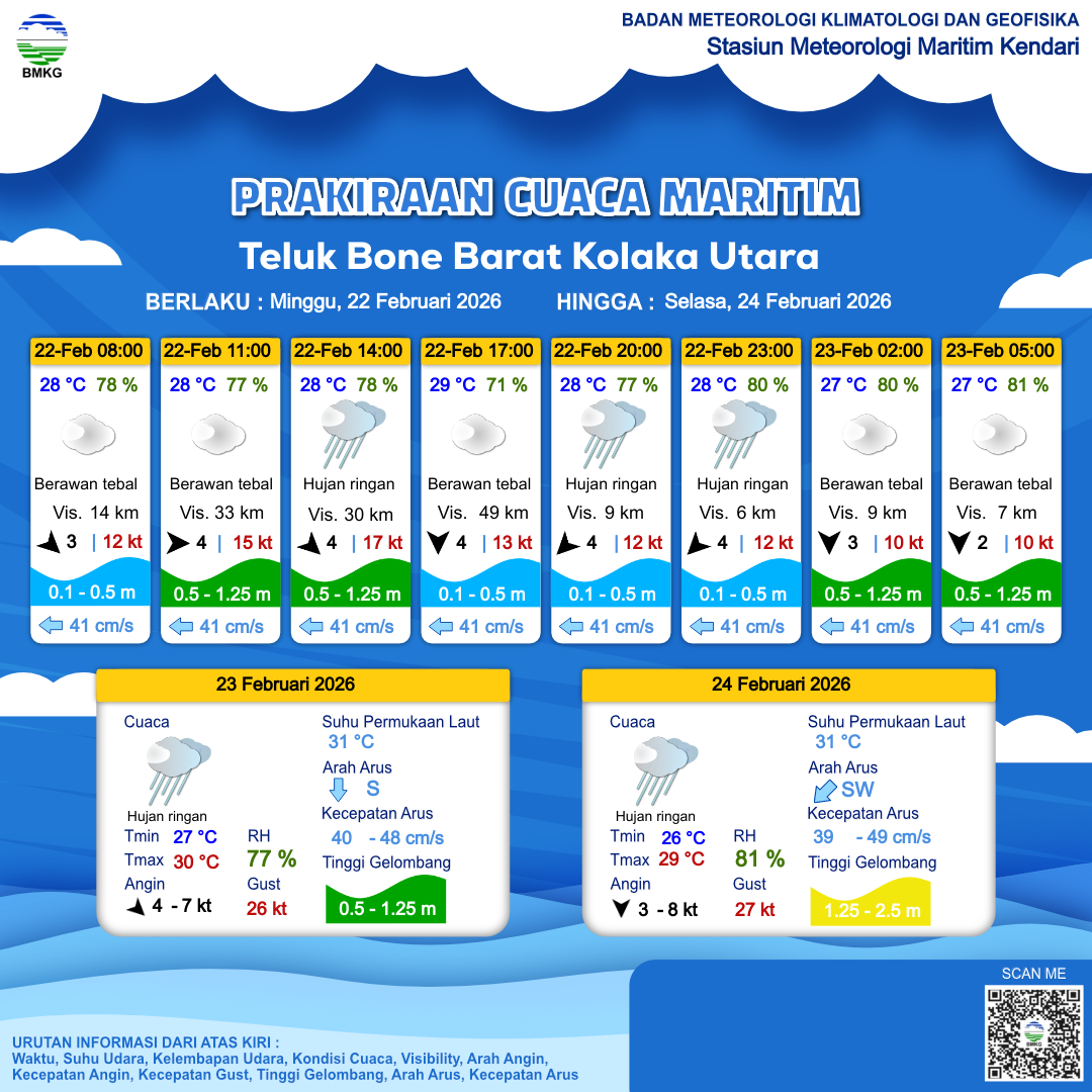 22 Feb 26, 14.00 3 jam kedepan | Timur Laut 4 kt Gust Peningkatan kecepatan angin yang singkat dan tiba-tiba : 14 kt | 0.2 m Tenang | Selatan 36.0 cm/s | 28 °C | 80 % | |