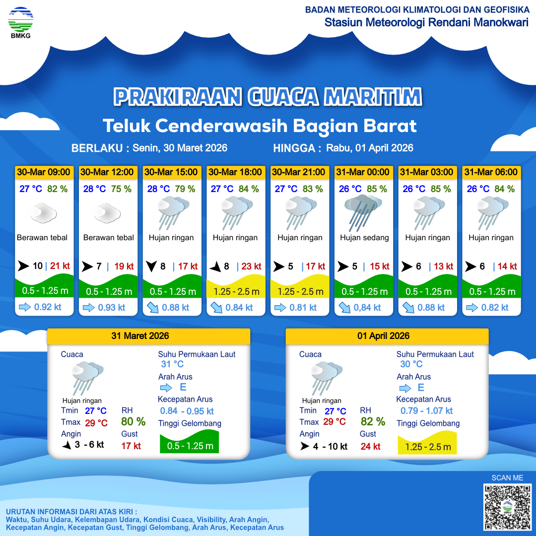 30 Mar 26, 21.00 12 jam kedepan | Barat 6 kt Gust Peningkatan kecepatan angin yang singkat dan tiba-tiba : 14 kt | 0.9 m Rendah | Timur 0.8 Knots | 26 °C | 84 % | |