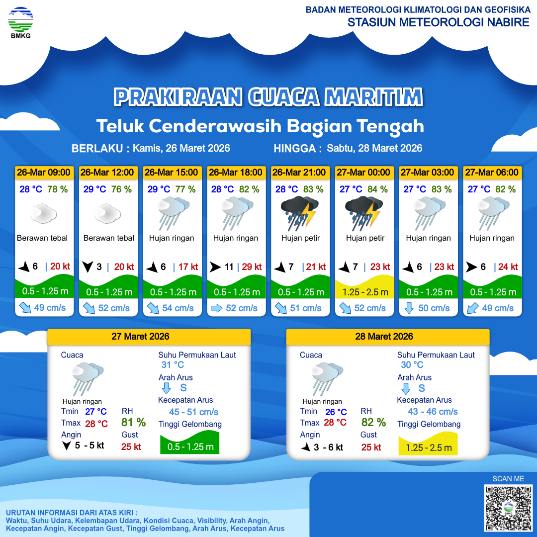 26 Mar 26, 09.00 11 jam kedepan | Barat 11 kt Gust Peningkatan kecepatan angin yang singkat dan tiba-tiba : 29 kt | 1 m Rendah | Timur 52.0 Knots | 28 °C | 82 % | |