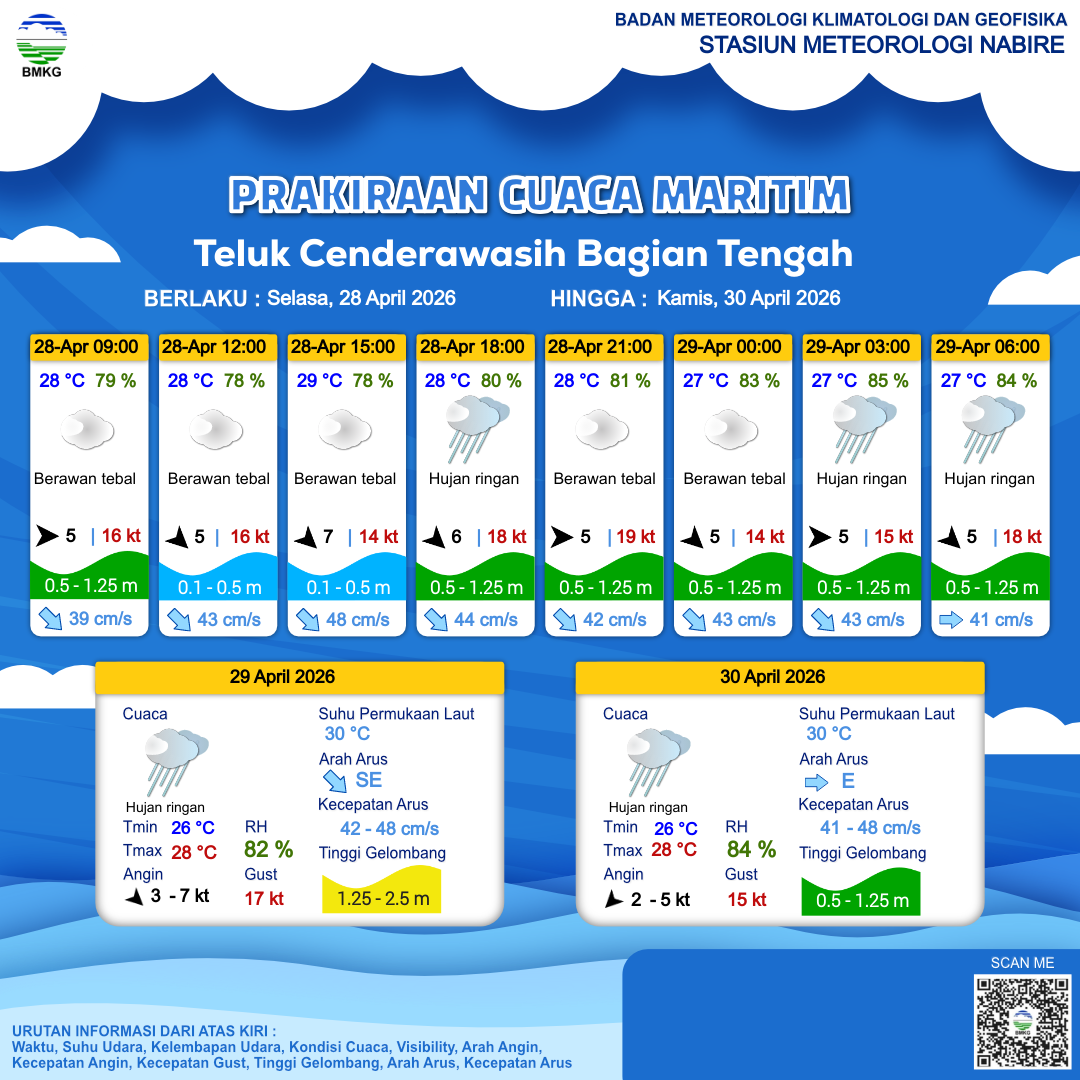 27 Apr 26, 23.00 4 jam kedepan | Berawan Tebal | Barat Daya 6 kt Gust Peningkatan kecepatan angin yang singkat dan tiba-tiba : 13 kt | | | 28 °C | 81 % |
