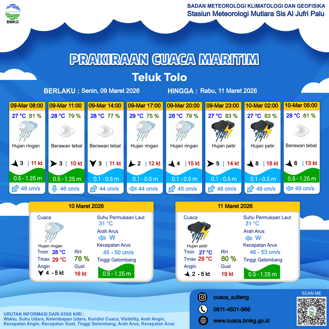 9 Mar 26, 23.00 4 jam kedepan | Berawan Tebal | Barat Laut 5 kt Gust Peningkatan kecepatan angin yang singkat dan tiba-tiba : 11 kt | | | 28 °C | 79 % |