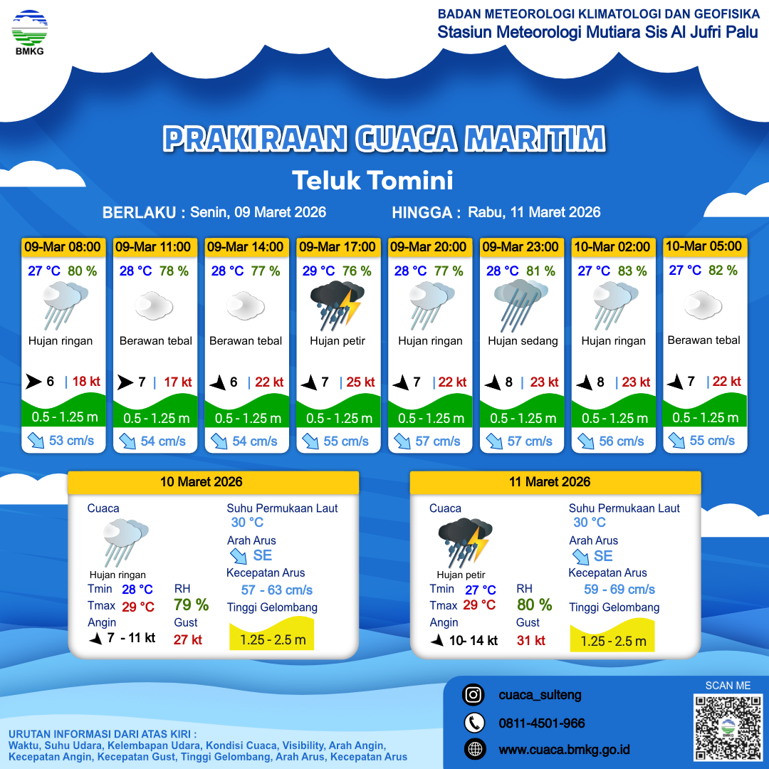 9 Mar 26, 21.00 4 jam kedepan | Berawan Tebal | Barat Laut 7 kt Gust Peningkatan kecepatan angin yang singkat dan tiba-tiba : 22 kt | | | 27 °C | 82 % |
