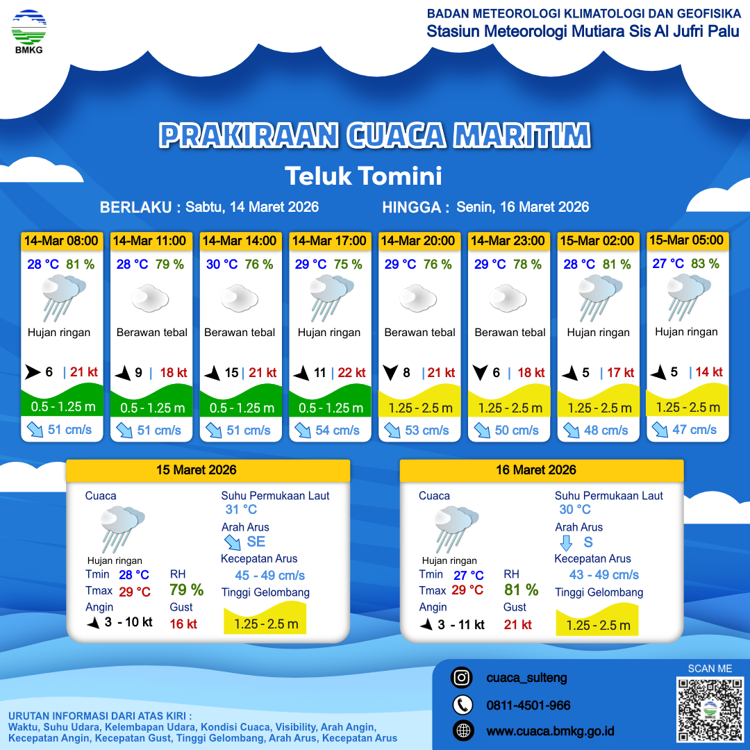 14 Mar 26, 20.00 3 jam kedepan | Barat Laut 5 kt Gust Peningkatan kecepatan angin yang singkat dan tiba-tiba : 15 kt | 1.4 m Sedang | Tenggara 47.0 cm/s | 28 °C | 82 % | |