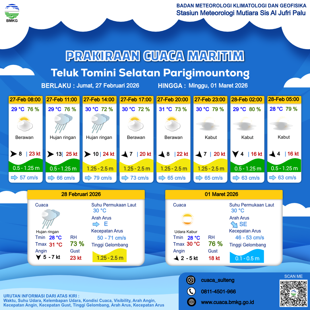 27 Feb 26, 23.00 3 jam kedepan | Berawan | Barat Laut 7 kt Gust Peningkatan kecepatan angin yang singkat dan tiba-tiba : 21 kt | | | 28 °C | 77 % |