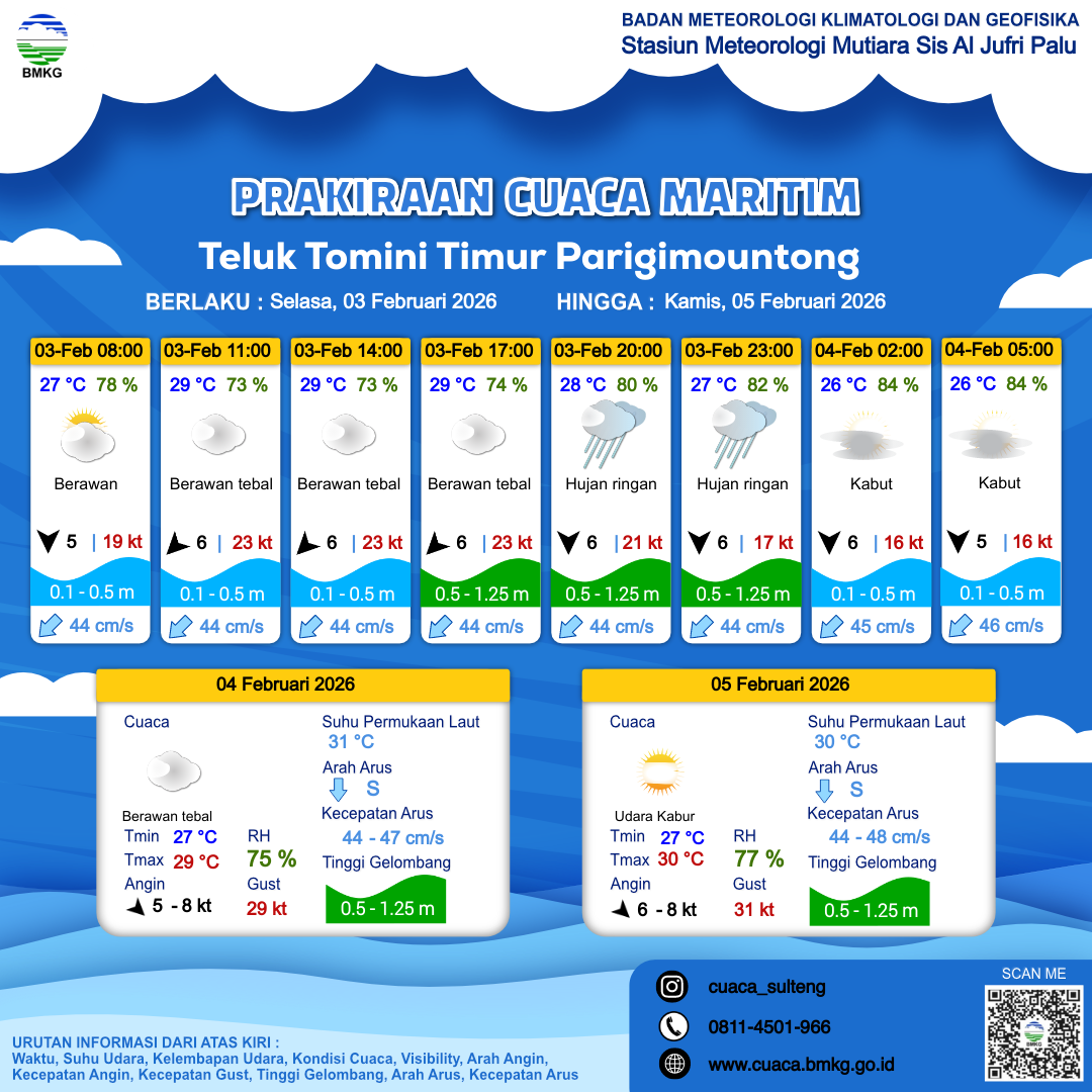 3 Feb 26, 22.00 3 jam kedepan | Kabut | Utara 5 kt Gust Peningkatan kecepatan angin yang singkat dan tiba-tiba : 18 kt | | | 26 °C | 84 % |