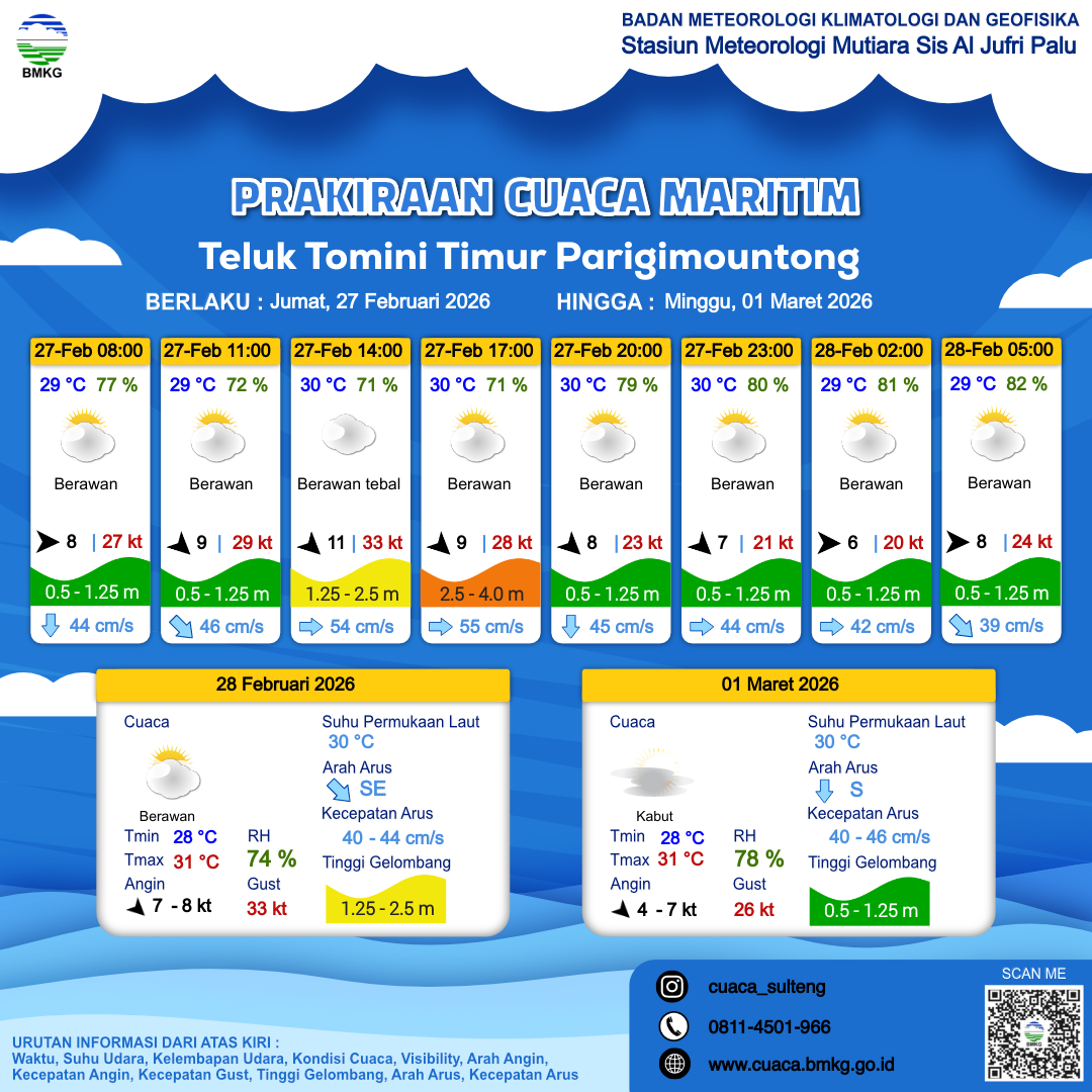 28 Feb 26, 06.00 4 jam kedepan | Utara 7 kt Gust Peningkatan kecepatan angin yang singkat dan tiba-tiba : 30 kt | 1.4 m Sedang | Tenggara 44.0 cm/s | 31 °C | 67 % | |