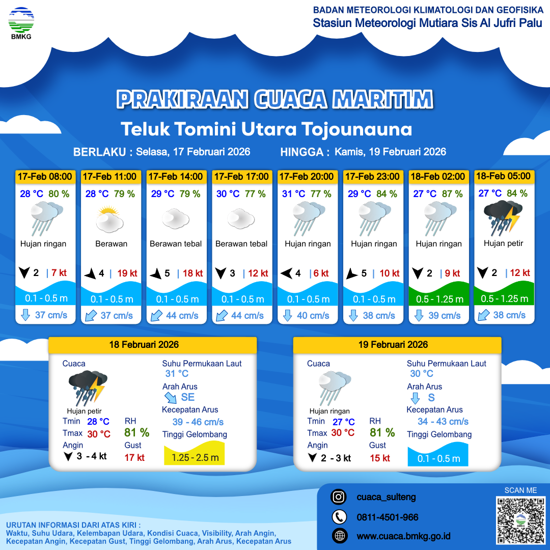 17 Feb 26, 17.00 3 jam kedepan | Utara 2 kt Gust Peningkatan kecepatan angin yang singkat dan tiba-tiba : 10 kt | 0.8 m Rendah | Selatan 38.0 cm/s | 28 °C | 85 % | |