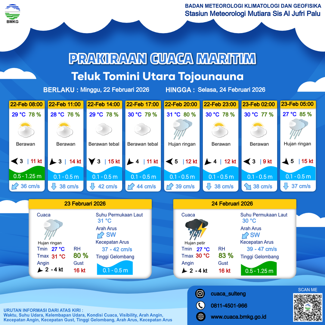 22 Feb 26, 19.00 2 jam kedepan | Timur 3 kt Gust Peningkatan kecepatan angin yang singkat dan tiba-tiba : 13 kt | 0.2 m Tenang | Selatan 37.0 cm/s | 29 °C | 81 % | |